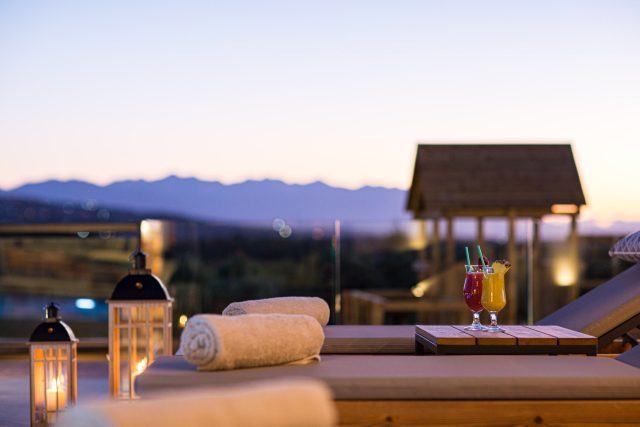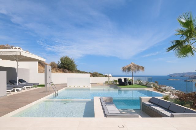 Enjoy the luxury comforts of this extraordinary large villa with it’s spacious outdoor settings. Dip your toes in the crystal clear waters of the 40m2 private swimming pool and relax under the warmth of the Greek sun on the premium sun beds or one of the lounge and coffee areas. From the impeccable design to the private infinity pool, the villa’s enclosed and private setting is a real lure for guests of all ages. Grown-ups can lounge to their sun loungers before idling back for al fresco barbecues (gas) under sunset skies. The property features also a children’s pool and five seater heated spa whirlpool. Designed for ultimate play time, the retreat features also an outdoor playground, mini soccer and volleyball net for our younger guests to inspire togetherness. A private parking is also available at the villa premises.