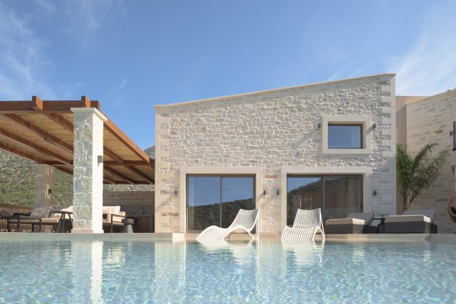With a private 40m2 pool and heated outdoor spa whirlpool, Alma Villa emerges from a storyline of timeless elegance, with rare access only for the privileged few. Wake up with the breathtaking pool views outside your window in this one-of-a-kind spacious villa. This is a luxurious heaven, featuring an iconic pool with premium sun beds, four luxury bedrooms with en-suite bathrooms, an outdoor playground, gym and fitness equipment, making it a dream holiday home that can comfortably welcome up to 9 guests to unwind. With an impeccable design, featuring white and soft grey tones blending with Mother Nature's shifting moods and settled in Aggeliana ( short driving distance to the beach). With expansive nature views, this large luxury self-catering home has been created with joy, relaxation and kinship above all else. Ensconced within 1.500m2 outdoor living, a private 40m2 pool, children’s pool and a covered alfresco dining table with BBQ (Gas), set on spectacular grounds and the villa has been designed with group gatherings in mind. This is an iconic home, to cherish your holidays with your family and beloved ones, as it can comfortably welcome up to 9 guests to unwind in magical Crete.