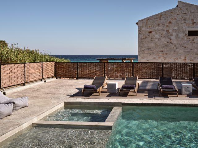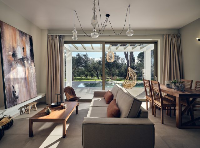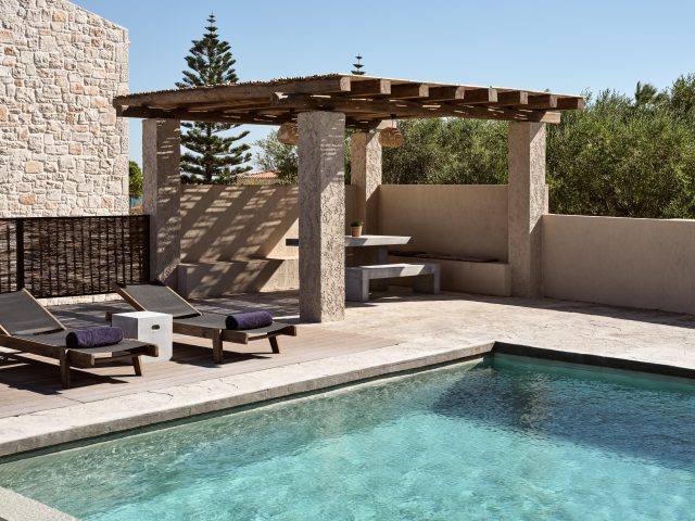 Living Room featuring iconic design & 65’ Smart TV, Fully Equipped Kitchen with direct access to the pool & outdoor dining areas • A couch located at the Living Room can welcome two more guests • An additional shared WC, is also available next to the Living Room • Twin Bedroom featuring 2 x single beds (0.90x2.00) & en suite bathroom with walk in shower & direct access to the pool with a smart 43’ TV