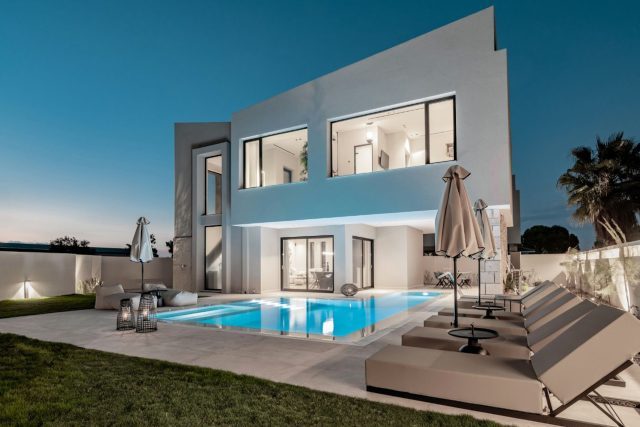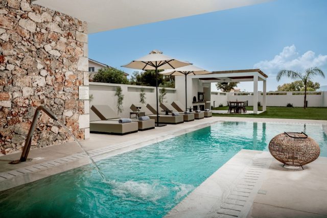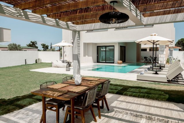 This captivating villa lays in 500m2 outdoor area and is embellished with a 60m² private swimming pool (1,40 meters deep, non heated), also boasting hydromassage features with 6 seats, premium sun-beds & umbrellas. Grown-ups can lounge to their premium sun loungers before idling back for al fresco dining under sunset skies, on the shaded outdoor dining area. The Living Room & Kitchen area have access to the pool area, and also the ground floor bedroom. There is sufficient parking space for up to 5 cars outside of the villa premises. With bespoke outdoor settings & tableware, it is an ideal holiday escape for those who seek the ultimate summer living and an unforgettable holiday experience.