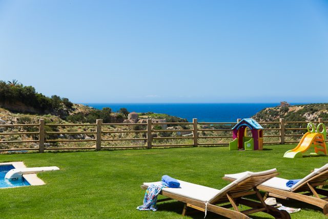 Chainteris Villa IΙ features a captivating 20m² private swimming pool (1,40m depth, non-heated), offering mesmerizing views of both the sea and mountains. For added safety and peace of mind, a protective sturdy wooden pool fence is available upon request. The expansive outdoor area is thoughtfully designed for ultimate relaxation, complete with comfortable sunbeds, a comfortable swing lounger by the pool, and a shaded dining area featuring charcoal BBQ facilities—perfect for unforgettable al fresco dining experiences. Families will appreciate the outdoor playground, featuring a trampoline, playhouse, and a variety of outdoor toys, providing endless entertainment for children. The partially lawned garden offers generous space for both relaxation and play, while the villa's tranquil terraces provide a serene setting for guests to unwind in comfort. An outdoor shower enhances convenience, perfectly complementing the serene ambiance of this idyllic retreat—ideal for creating cherished holiday memories.