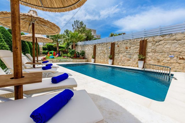 Vera Natura Villa I boasts a beautiful 500m² outdoor area, thoughtfully designed for summer living. A 35m² private pool (1.60m depth, non-heated) features a dedicated children’s compartment (1.5x1.5m, 0.30m depth), creating a safe and fun zone for young guests. The pool is enriched with fiber optic lighting, casting a magical glow after sunset.