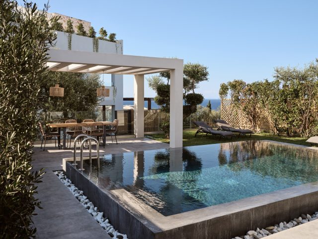 The spacious suite spreads around the ground floor, making it an ideal escape for a couple. Lounge at the open space living room and watch the sunset lazily on the horizon at the pool, before curling up on the sofa with a paperback. Set up a movie marathon at the Smart 50’ TV on long summer nights, for an ultimate home cinema feeling. A bespoke living-cum fully equipped kitchen awaits to inspire you for culinary wonders. The villa features a bedroom with a double bed, with en-suite bathroom and can comfortably accommodate up to two guests. The Home features a KNX Smart House System for ultimate comfort.