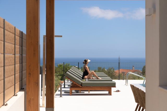 This delightful holiday villa exudes warmth with its minimalist design and carefully curated details. Spanning 120m² of indoor space, it offers three comfortable bedrooms, each with an en-suite bathroom, along with a cozy living area and a fully equipped kitchen—perfect for a serene family retreat. For added convenience, there is an additional WC near the living area. Accommodating up to seven guests, the villa is thoughtfully designed for both comfort and privacy. One of the bedrooms features its own entrance, providing enhanced individuality and direct access to the pool. A TV is provided in the living room and one of the bedrooms, thoughtfully placed to maintain a tranquil, screen-free ambiance during bedtime, fostering a true sense of sanctuary. With its welcoming ambiance and practical layout, this villa offers an ideal setting for a relaxed, sea-view getaway.